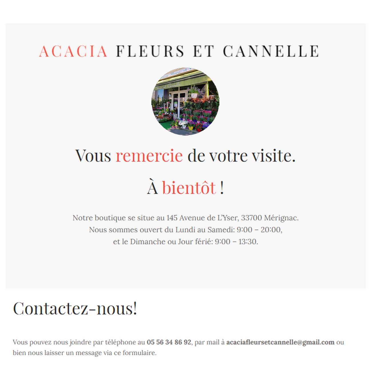 Fleuriste à Mérignac depuis 20 ans, Linda Do Vale a fait appel à nous pour créer son site internet. Cliente au regard exigeant, elle souhaitait prolonger l’univers de sa boutique virtuellement et proposer ses offres au plus grand nombre. Dans un style épuré mais élégant, ce site met en exergue les nombreux services que permet la boutique Acacia Fleurs et Cannelle. Une galerie de photographies des différentes réalisations et compositions des fleuristes listées par catégories permet un aperçu efficace en fonction des centres d’intérêt des visiteurs.